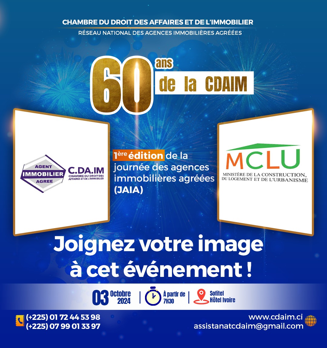 A l’occasion des 60 ans de CDAIM (Chambre du Droit des Affaires et de l’Immobilier), nous organisons la première édition de la Journée des Agences Immobilières Agréées (JAIA). Tout le réseau national des agences immobilières agrées y est invités.