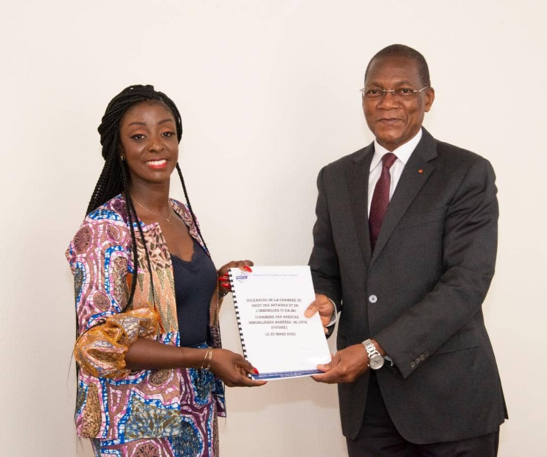 Ce lundi 20 mars 2023, une séance de travail a eu lieu entre une délégation de la Chambre du Droit des Affaires et de l’Immobilier (CDAIM) conduite par la Présidente, Madame Carole OLLO et le ministre de la construction, du logement et de l’urbanisme (MCLU) S.E.M Bruno KONE.